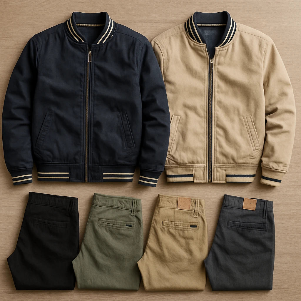 • Cores versáteis e masculinas: caqui, verde, preto e cinza escuro — combinações que funcionam em qualquer ocasião.
